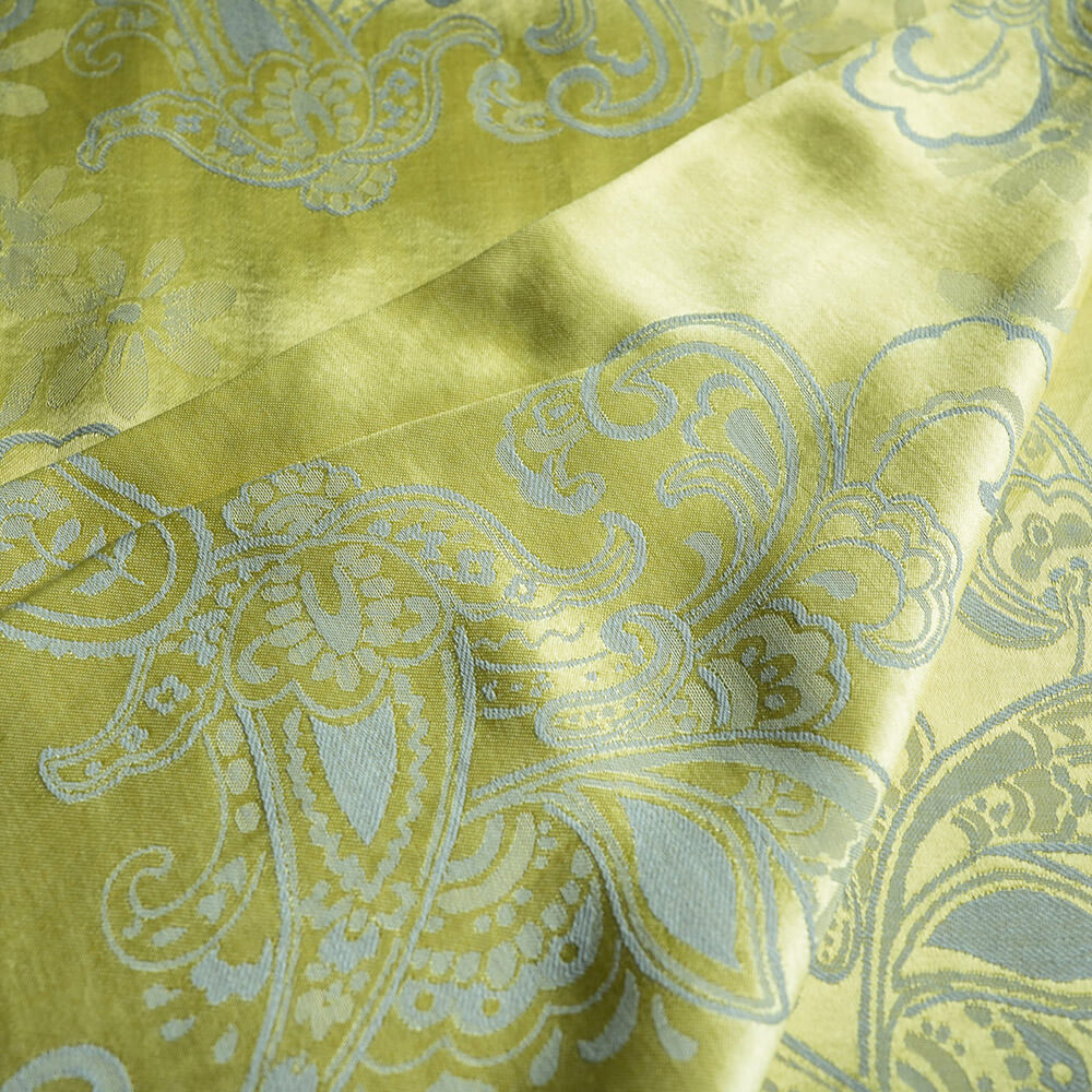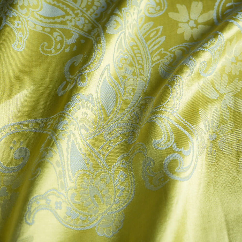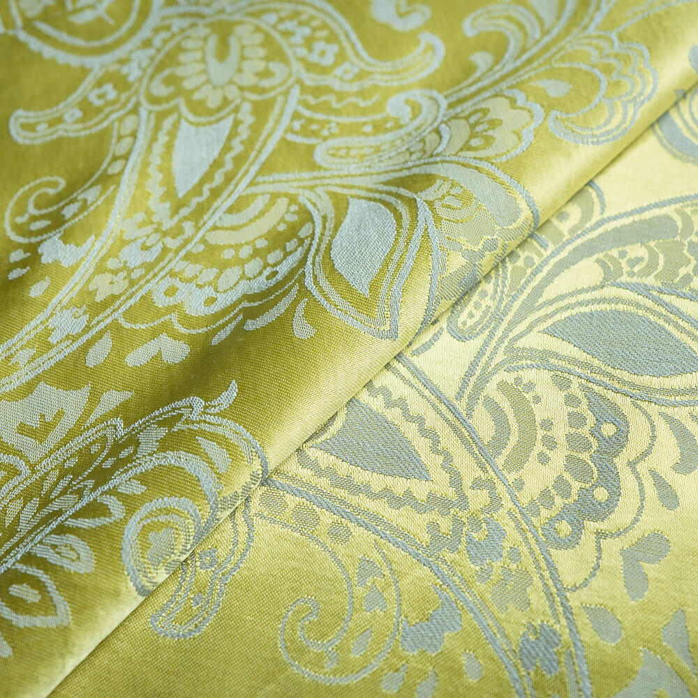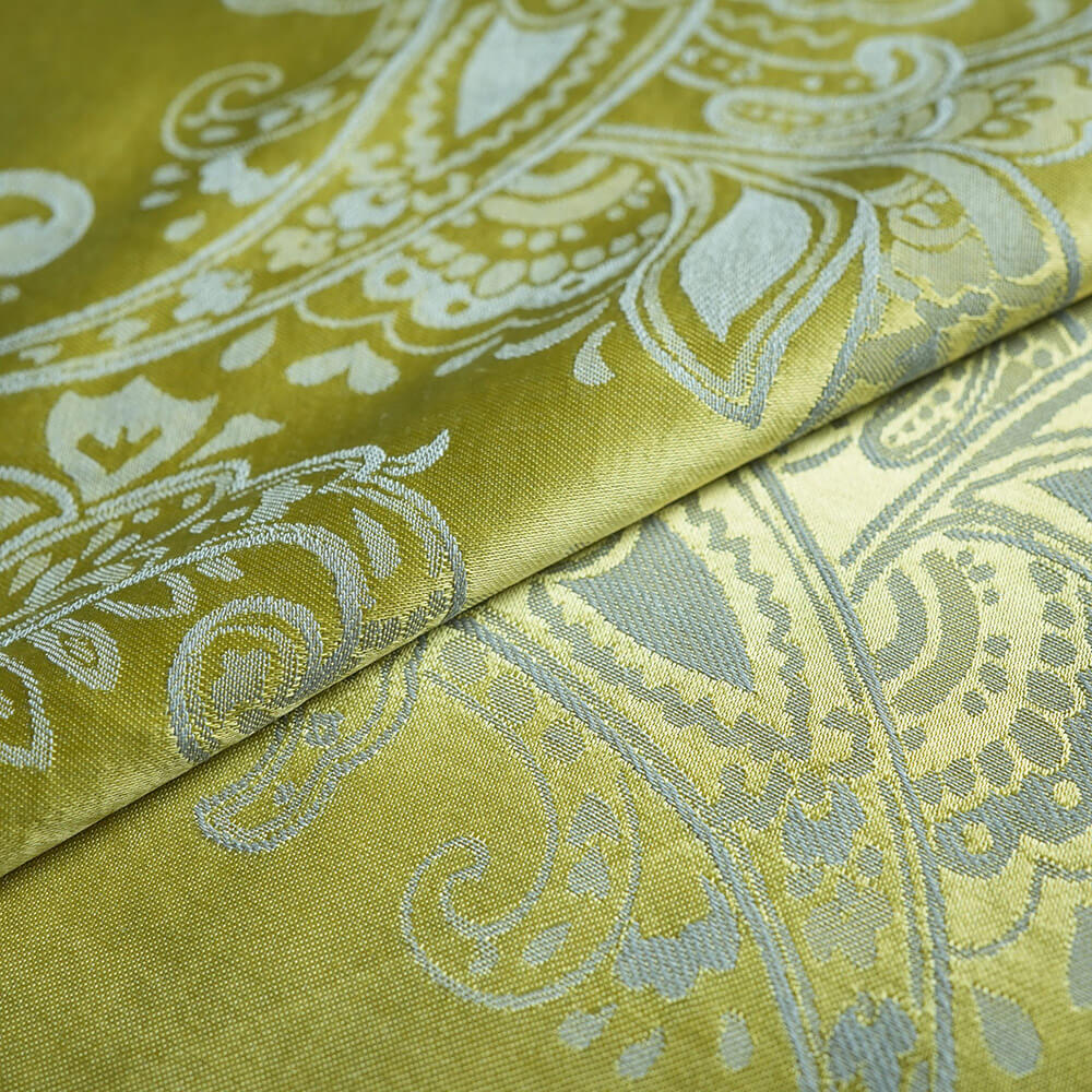 A fabric that exudes sophistication and glamour with its intricate paisley design and its lustrous gold hue. This fabric is made of high-quality materials that are durable and soft to the touch. This fabric is ideal for creating bespoke garments or home decor items that will add a touch of luxury and style to your space.