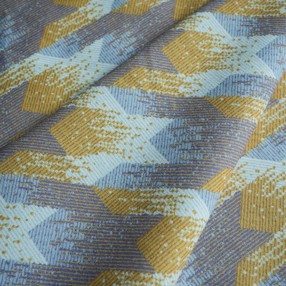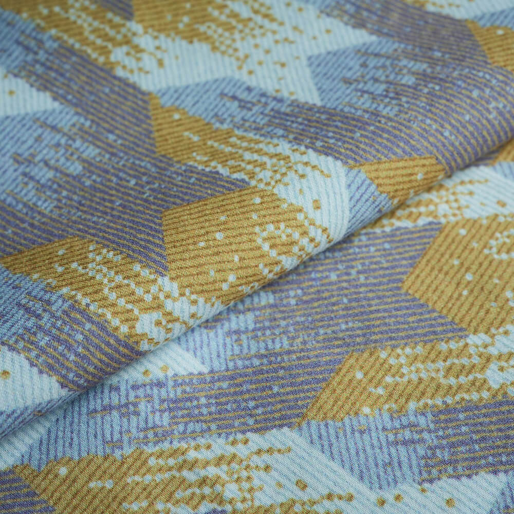 Polyester cold silk cotton printed houndstooth fabric is a fabric blended from polyester, cold silk and cotton. It is light, breathable, soft and comfortable. Printed houndstooth is a classic geometric pattern formed by interlacing lines of two or more colors, often used to create fashionable clothing and accessories. This fabric is suitable for spring and summer, and can create an elegant, retro, and casual style.